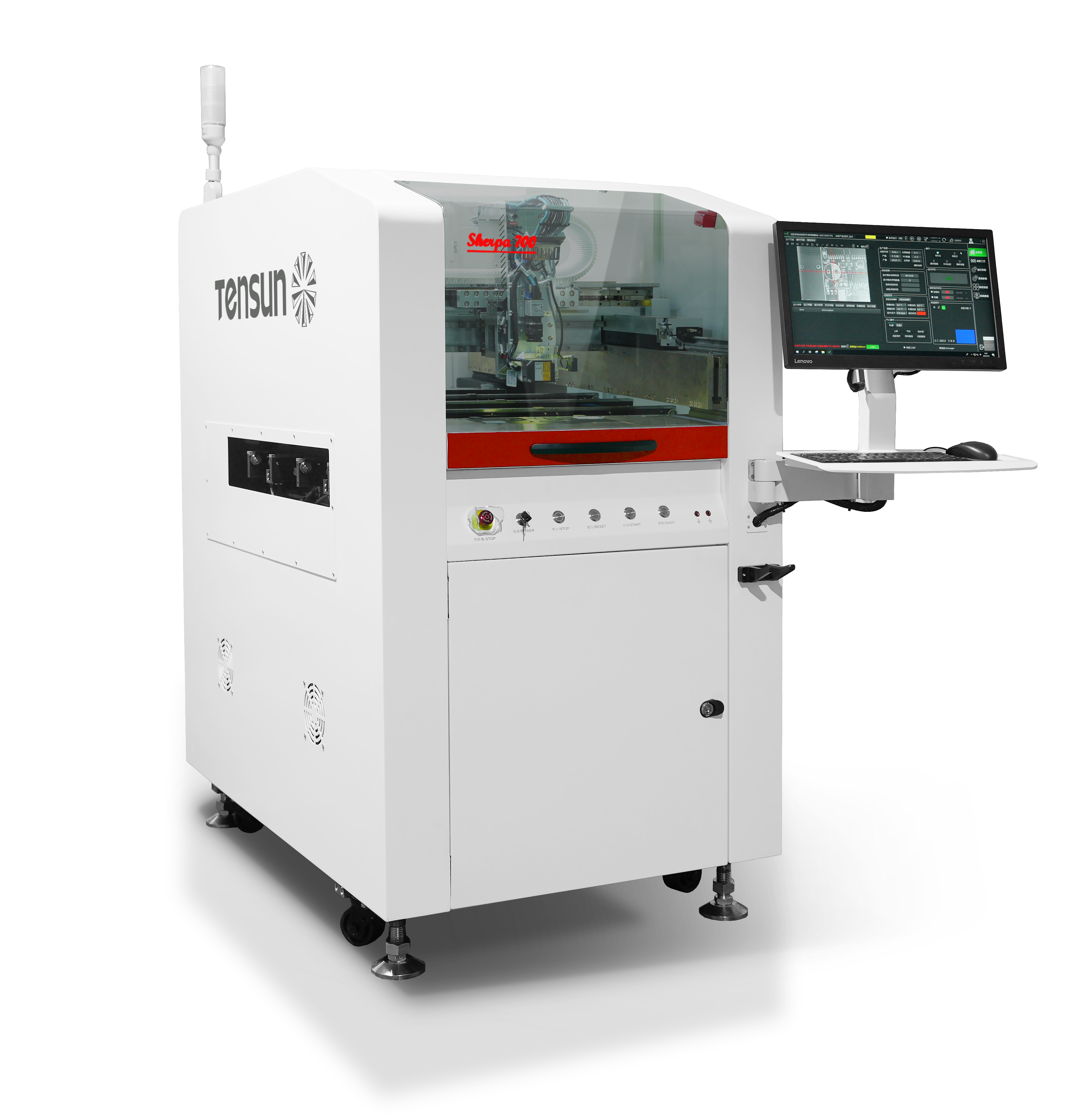 在精密點(diǎn)膠設(shè)備中,騰盛精密帶來了最新產(chǎn)品高速噴錫設(shè)備Sherpa700,可以實(shí)現(xiàn)噴錫點(diǎn)徑150±10μm,錫膏穩(wěn)定噴射頻率150Hz,即每秒可噴射出150個(gè)錫點(diǎn),處于行業(yè)領(lǐng)先的技術(shù)水平。設(shè)備主要應(yīng)用于芯片、PCB、元器件等產(chǎn)品的高精密微量錫膏噴印,半導(dǎo)體系統(tǒng)級(jí)封裝SIP、MEMS的微量噴錫等領(lǐng)域。