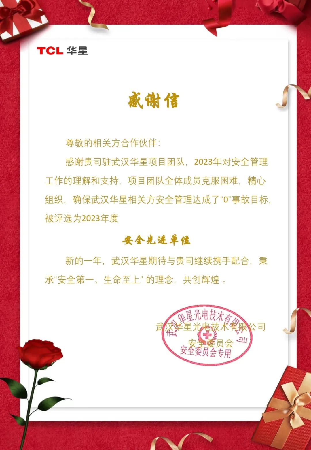 截止2023年底,TCL華星光電已連續五年授予Tensun騰盛“安全先進單位”,在五年的服務時間中,騰盛技術服務團隊達成了“0”事故目標,得到客戶的高度認可。